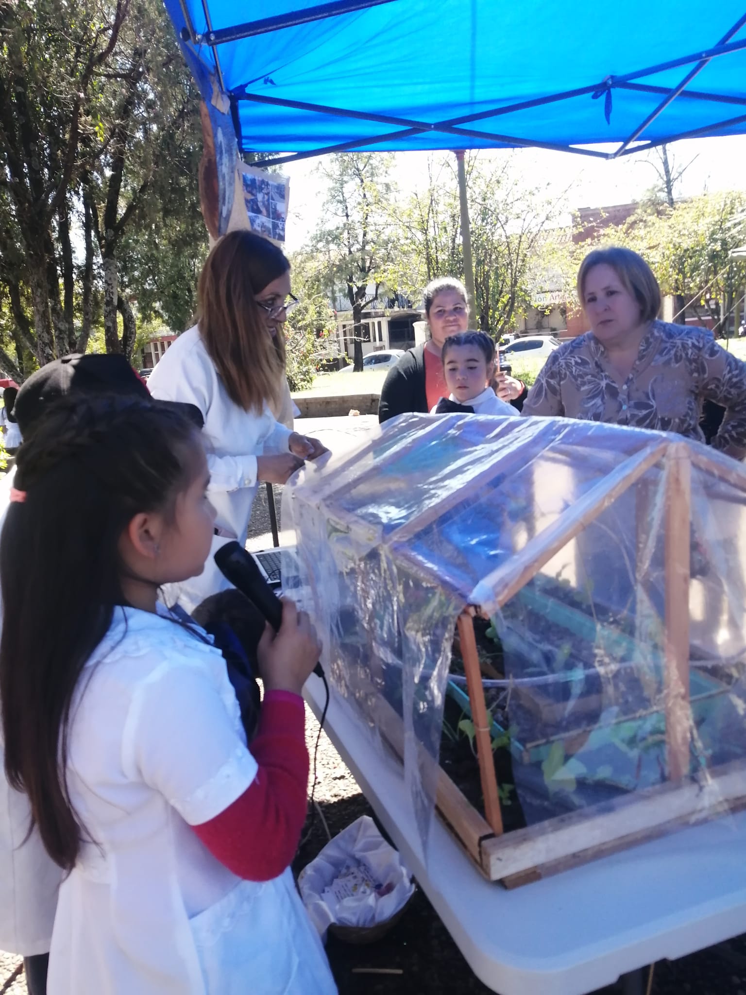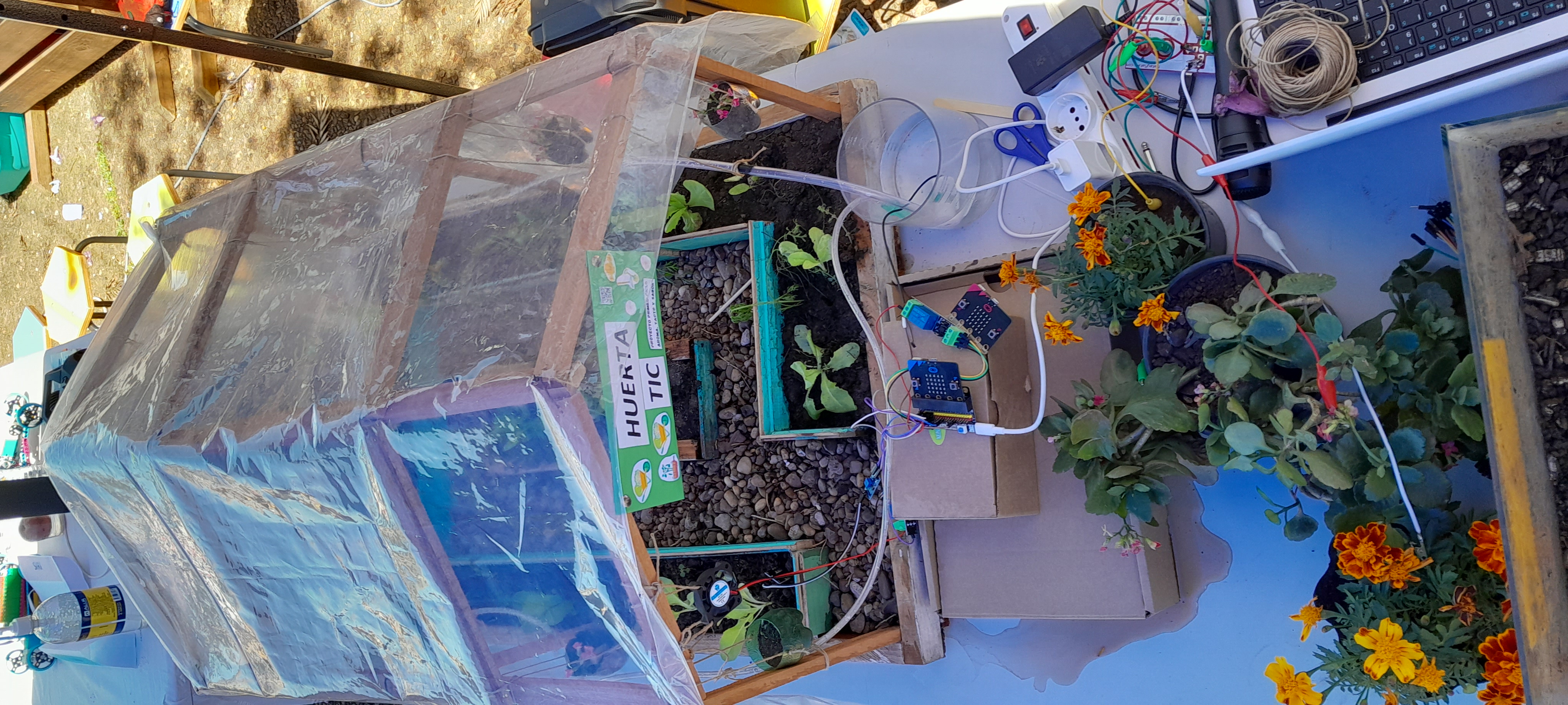 Por otro lado, con el objetivo de automatizar el riego de la huerta de la escuela, se construyó una maqueta de un invernadero automatizado basado en micro:bit y utilizando componentes externos como sensores de humedad de suelo, relés y una bomba de agua.