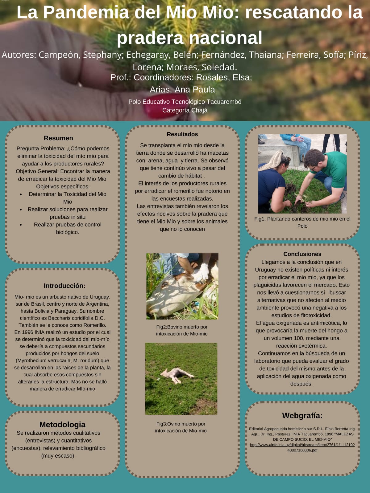 Se trabajó con base en la pregunta problema ¿cómo podemos eliminar la toxicidad del mío mío para ayudar a los productores rurales? El grupo de estudiantes trabajó en diseñar un dispositivo automatizado para erradicar el mío mío, que rocía la planta con una sustancia que lo elimina y funciona ingresando las medidas del cuadrante que se desea dejar libre de este arbusto.